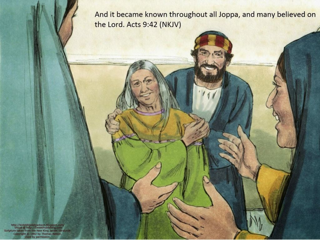 40 Peter sent them all out of the room; then he got down on his knees and prayed. Turning toward the dead woman, he said, “Tabitha, get up.” She opened her eyes, and seeing Peter she sat up. 41 He took her by the hand and helped her to her feet. Then he called for the believers, especially the widows, and presented her to them alive. 42 This became known all over Joppa, and many people believed in the Lord43 Peter stayed in Joppa for some time with a tanner named Simon.